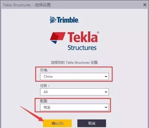 24.打开桌面Tekla2017软件,选择环境:China 配制:完全, 点击确定