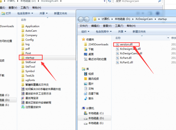第四步: 再把“破解文件”文件夹里的“32位星创全3D破解文件”文件夹里的“version.dll”文件复制到D盘上的D:\xcDesignCam\startup (D盘星创安装目录下的startup文件夹里) 即可!!!