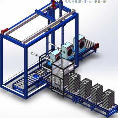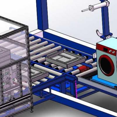 滚筒洗衣机整个装配过程分为滚筒洗衣机与底托,底托经过拆剁机分开,然后经过机械手进行和洗衣机底部安装,最后经过输送线输送走的过程。