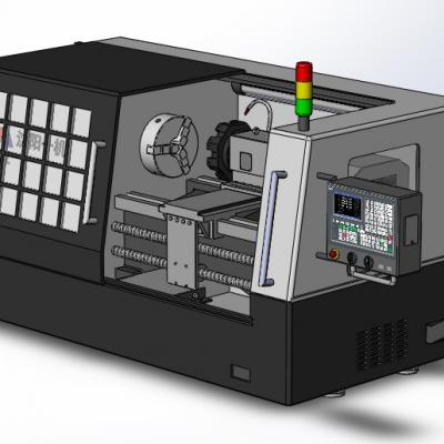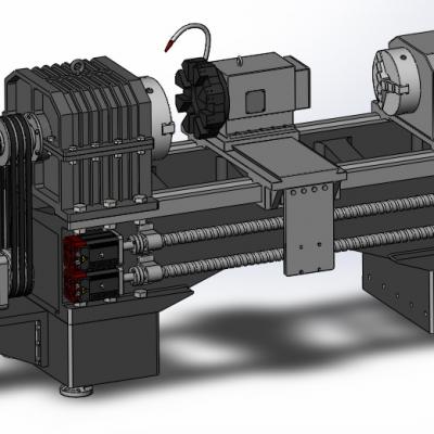 我设计的是“双主轴的数控机床”,设计他的思路是我在实习数控车床的时候,用的都是单主轴,这样掉头车削工件会产生基准不重合误差,如果采用双主轴可以很好的解决这个问题,所以我在原来机床的基础上,去掉了尾座,改成了主轴头,于是便得到了我的这个作品。