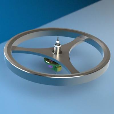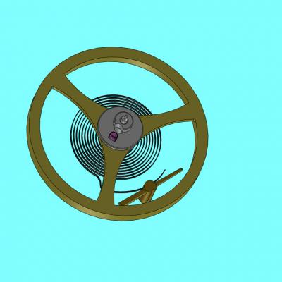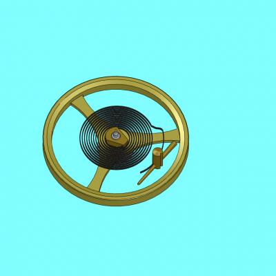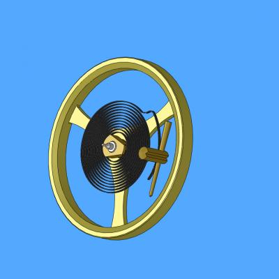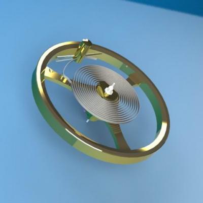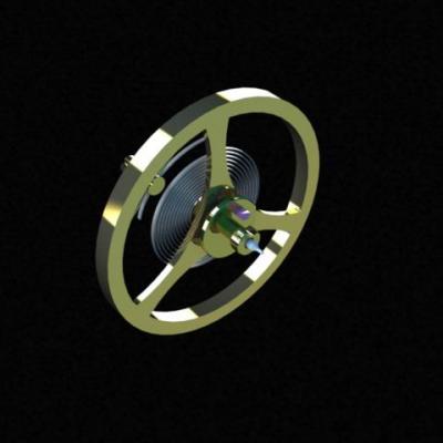 机械女表摆轮组件。摆轮这一部件是手表的心脏。把手表贴近耳朵听到的嘎达嘎达响的声音,就是摆轮摆动通过那个粉红色的圆盘钉再接触到擒纵叉以及擒纵轮所发出的声音。用Solidworks2010绘制。