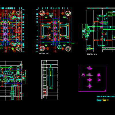14、图面的整理﹐包括剖切符号﹐哥林柱的插入﹐胶口的放大图﹐顶针表﹐排气槽﹐图框的放入﹐MARK表的填写等。