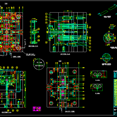 14、图面的整理﹐包括剖切符号﹐哥林柱的插入﹐胶口的放大图﹐顶针表﹐排气槽﹐图框的放入﹐MARK表的填写等。
