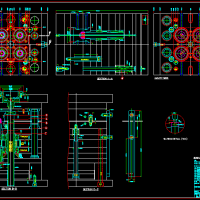 14、图面的整理﹐包括剖切符号﹐哥林柱的插入﹐胶口的放大图﹐顶针表﹐排气槽﹐图框的放入﹐MARK表的填写等。