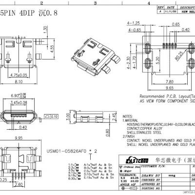 MICRO USB 5PIN 4DIP 沉0.8毫米,此类连接器曾经广泛用于手机、移动电源、音响设备数据线等领域,