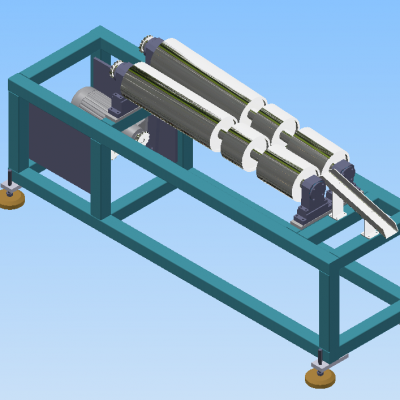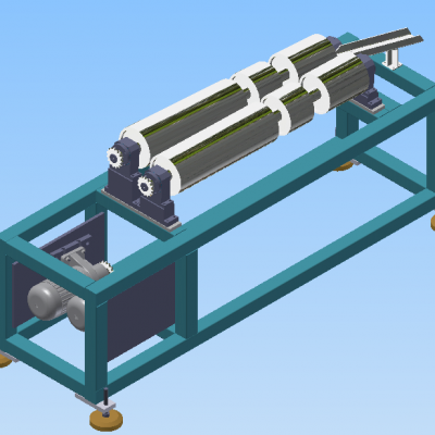 轴类零件自动旋转进给装置3D模型,本机构用于轴类零在制造工序过程能实旋转与轴向进给同时进行。主要运用在轴套类零件的自动淬火机床中。进给速度与转速可以通调速电机转速与辊的倾角参数皮配。