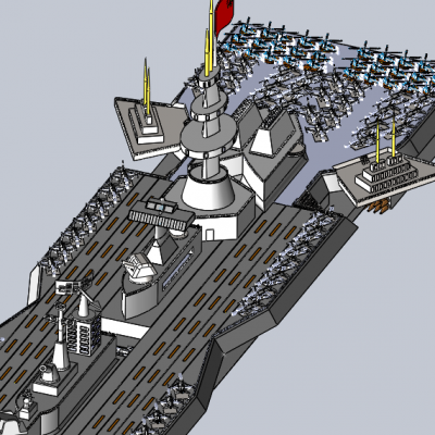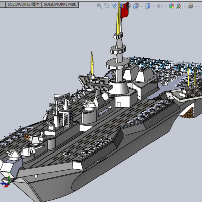 Solidworks软件设计的超级航母3D模型 有参数可编辑。 本超级航母使传统航母摆脱了脱离航母战斗群便成为“海上移动靶子”的名声,他有自己的武器,而且火力系统不俗。(航母上的飞机摘自网络)