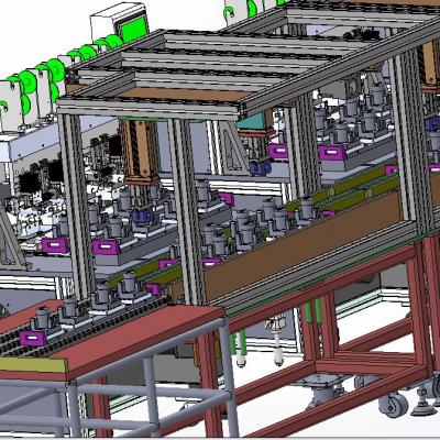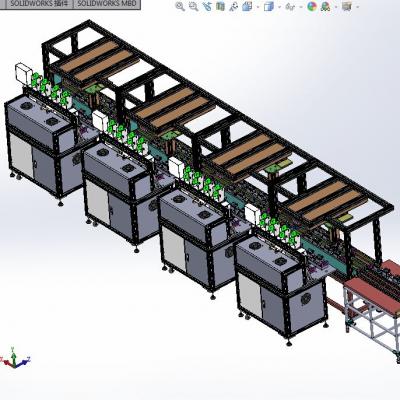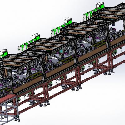 马达焊接流水线3D模型 SW设计sldasm﹑sldprt源文件提供。 输送线用途为单、串、半成品,空串盒返回运输、输送线主体结构为铝型材,皮带为2mm*450mm绿色PVC输送带、PVC输送带两端使用电机为:精研0.25KW电机+1:60齿轮减速机、输送线两端需要驱动,调整机构Φ145驱动滚筒+Φ38头尾、在单串焊工位相应的输送线下方有2-3个多功能插座、输送线主体结构所使用的铝型材为40*40铝型材,壁厚为3mm、输送线要求变频器为:(台湾台达变频器)IP220V 0.75KW变频器。
