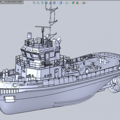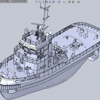 大型港口拖船、拖轮3D模型 SW设计sldprt文件提供,拖船用来拖曳没有自航能力的船舶、木排或协助大型船舶进出港口、靠离码头,或作救助海洋遇难船只的船舶。