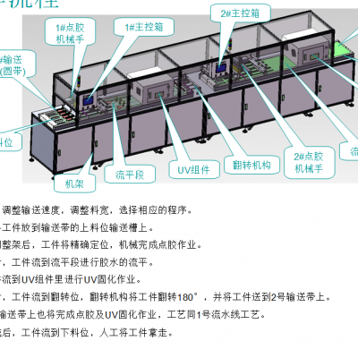 工件在2号输送带上也将完成点胶及UV固化作业,工艺同1号流水线工艺。