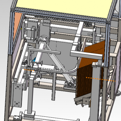 一款自动开箱机3D模型,气缸推动带吸头的滑架,使得吸头吸住纸箱,在导向杆的协助下打开纸箱,通过推杆,将纸箱向前推,折舍杆闭合底部箱盖,机芯封胶带。 未打样,仅供参考。
