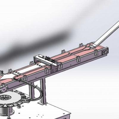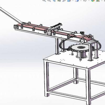 该款进料机,是自动进料装置3D模型,一种自动进料装置,其主要包括有一上举装置、一上推装置、一横进装置,该等装置共构一本体,其特征在于: 上举装置包括,在本体前方若干纵向架面上嵌设有可纵向移动的滑块,各滑块顶端并设有顶面具有倾斜状的斜块,及各滑块共同固设一举杆,并在各滑块共同向面设有齿条,各齿条则能与轴枢在若干纵向架预定处的齿轮啮合; 上推装置包括,在本体前方若干纵向架上方一横向架面上等距枢设有若干的推板,在各推板底端处并共同枢设有一拉杆; 横进装置包括,在本体最上方二横向架的间面上等距轴设有若干的辊轮。