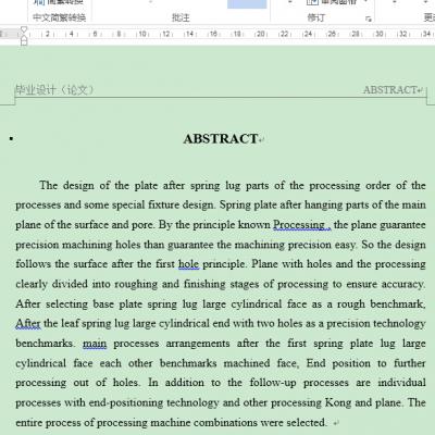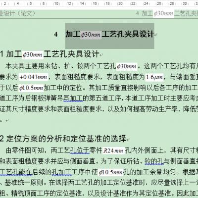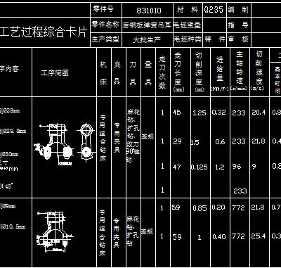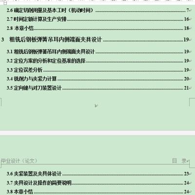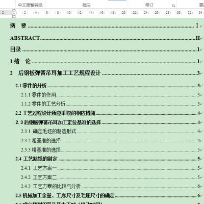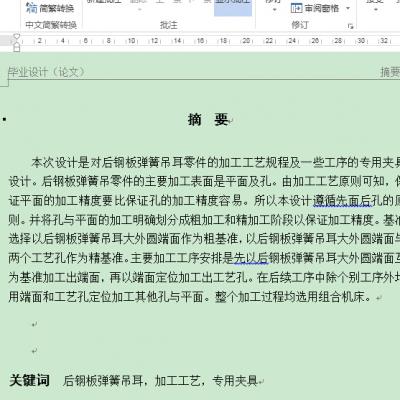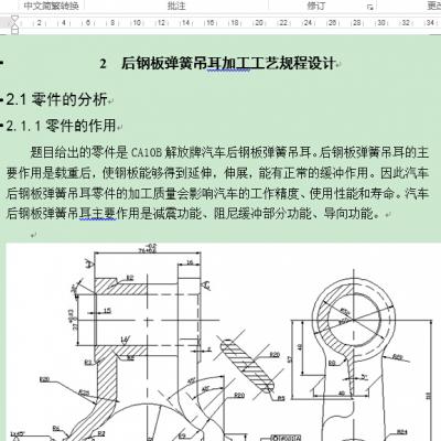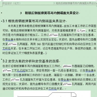 本次设计是对后钢板弹簧吊耳零件的加工工艺规程及一些工序的专用夹具设计。后钢板弹簧吊零件的主要加工表面是平面及孔。由加工工艺原则可知,保证平面的加工精度要比保证孔的加工精度容易。所以本设计遵循先面后孔的原则。并将孔与平面的加工明确划分成粗加工和精加工阶段以保证加工精度。基准选择以后钢板弹簧吊耳大外圆端面作为粗基准,以后钢板弹簧吊耳大外圆端面与两个工艺孔作为精基准。主要加工工序安排是先以后钢板弹簧吊耳大外圆端面互为基准加工出端面,再以端面定位加工出工艺孔。在后续工序中除个别工序外均用端面和工艺孔定位加工其他孔与平面。整个加工过程均选用组合机床。
