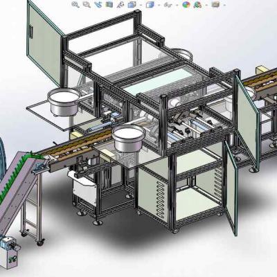 双头组装旋熔机是一台自动组装与热熔设备,是把产品组装后在加热大一点温度热熔连接后的工艺设备,设备采用双热熔头提高了设备效率,而且有定位机构对精度也提高了,设备的结构很新颖值得参考,外观也设计的很漂亮。是一台比较好的组装与热熔设备。通过旋熔焊接方式将一件产品两端盖子组装并且焊接上去,达到焊接之后的成品表面无划痕,无溢料现象。 设备能实现产品的全自动化生产。 效率:2~3 S/PCS 此款为设备加工3D图纸。sldasm﹑sldprt源文件提供,建议使用Solidworks 打开.