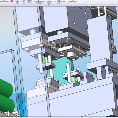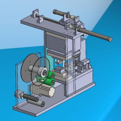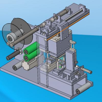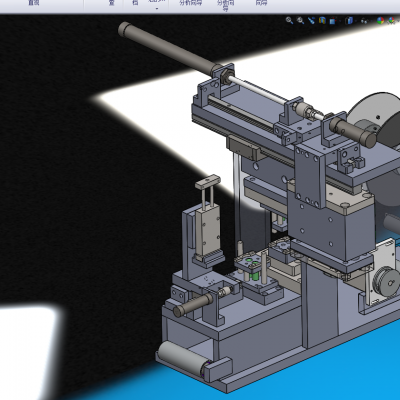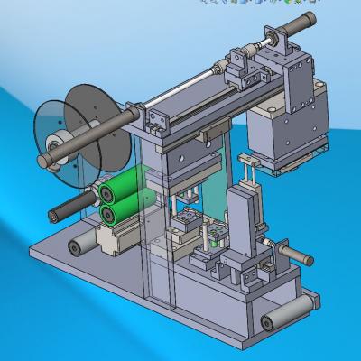 薄膜冲压冲切成型机,是专门针对未加工的薄膜产品进行冲压冲切,冲压冲切的形状可以有很多,需要什么样的形状就做什么样的冲压治具,现这套图纸上的冲压结构是一次冲压一片薄膜,冲压和吸取及贴薄膜是一次性完成的图中的气缸和滑轨就是带动冲压和贴薄膜的结构。