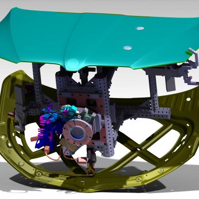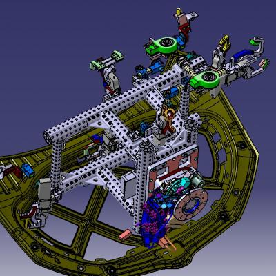 汽车引擎盖双面机器人抓手,分两面,一面专用于汽车引擎盖内板自动抓取,另一面专用于汽车引擎盖总成自动抓取。用欧标铝型材搭建,模块化结构通用性强,可灵活组合的柔性框架、定位销、夹紧块、连接件、吸盘等适应不同的结构类型的机盖定位。固定的六轴机器人的法兰盘上使用。有CATIA R20装配体源文件模型、及通用stp格式文档。