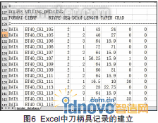 通过深入的研究,在掌握NX自带刀具库的文件结构和信息记录结构后,根据单位的实际应用情况,按照“定名称、定类型、定参数”等方式将刀具进行标准化、系列化管理,然后按刀具记录结构进行新的刀具记录创建和新的刀柄记录创建。创建时,应用Excel电子表格应用软件,以便方便地进行批量记录的编辑和维护,建立的刀具记录如图5所示,建立的刀柄记录如图6所示。