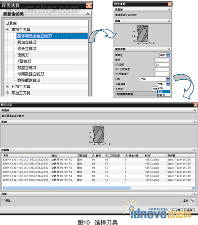 (1)选择创建刀具,再在创建刀具界面中用鼠标单击“从库中调用刀具”命令,从库中调用肯纳的直径16mm的刀具记录,在弹出的窗口中输入匹配数据,查询并列出所有可用记录,并选择所需刀具,如图10所示。
