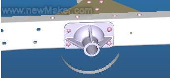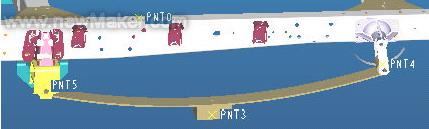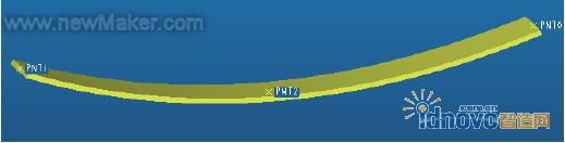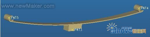 (4) 完成主片模型以后,再利用加材料的命令,完成整个简化模型的建立,并且在两边卷耳的中心各建一个点PNT04 和PNT05,以及在板簧下接面中心处建一个点PNT3,这样一个能上跳、下跳和反弓的简化板簧模型就完成了。