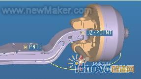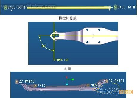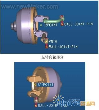 在零部件的建模过程中,要在左右转向节的主销中心处、纵横拉杆球销中心、横拉杆球头座中心、前轴主销中心处各建一个点。