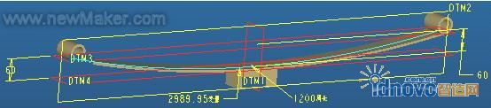 (1) 首先在基准面DTM2 上建立一条曲线,利用三点确定一条圆弧和标周长、弧高的建模方法建立一条板簧自由状态下板簧主片中心的圆弧曲线。