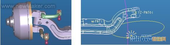 (2) 以左横拉杆节臂上的球销中心点为轴心,做一个半径等于横拉杆长度的曲面球,在曲面球和右横拉杆节臂球销中心的轨迹曲线的交点处建一个点APNT1;