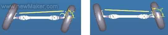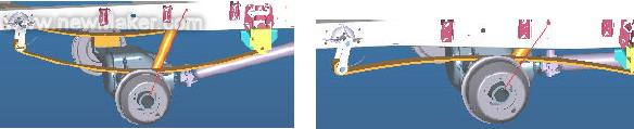 这样,我们就可利用更改前后板簧的弧高和前桥的左右转向角来进行前减振器行程的校核、传动轴长度的校核、轮胎与货箱地板间隙的校核、轮胎与驾驶室轮罩的运动间隙以及转向与前悬架的运动干涉等其他方面的运动校核。