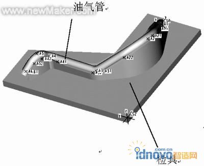 直的橡胶管穿在已弯成所需产品形状的不锈钢芯棒上,在硫化炉中对橡胶管进行硫化定型,通过水冷得到成品即油气管。汽车油气管检具就是检测油气管是否合格的一个装置,因此,检具的制作精度要求较高,检具完成后对其进行检查,以判断检具是否合格,检具一般在三坐标测量仪上进行测量,以点的形式进行检查。油气管的几何图形由两个同心圆沿一条样条曲线扫描而成,由于是一条空间样条曲线,对油气管及其检具采用Pro/ENGINEER软件作为产品和检具设计、数控编程的软件平台,在BeiJing FANUC—450数控铣床对其进行加工,通过Pro/ENGINEER的装配模型和二次开发技术得到所需测量点的坐标,以检验产品是否合格。