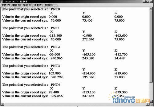 ProAsmcomppathTrfGet()函数可得到选择零件相对根装配体的转换矩阵,选择图3中的B、C零件,可得到B、C零件的转换矩阵。由于关于Pro/ENGINEER的二次开发的文章很多,在本文中就不再具体描述,通过坐标转换理论,得到如下的结果。以此图1(b)为例,通过Pro/ENGINEER的二次开发,得到如图4所示结果。为检验其转换是否正确,通过Pro/ENGINEER中的Analysis菜单可以进行测量,最终结果与转换的坐标结果一致。