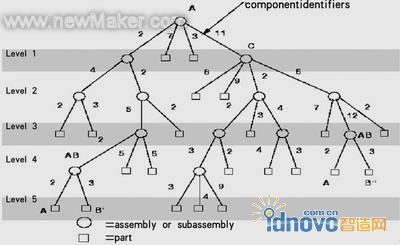 在图2所示的装配体中,子装配体C在装配体A中的部件标识值为11,零件B在装配体AB中的部件标识值为3等。图2中的子装配体AB在不同的地方出现了两次(也就是同一部件在装配体中的不同地方装配了两次),它的组成部件B(也出现了两次)的标识路径却不同,其具体标识如下: