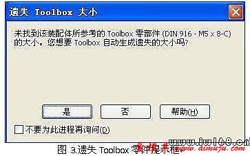 在安装SolidWorks于不同电脑的环境下,由于各个电脑硬盘分区不一致,使得SolidWorks Toolbox的安装路径不同。因此一个装配体已经应用了Toolbox库中的标准零件,换到另一台电脑下打开,就有可能出现找不到Toolbox库中的标准零件的情况。主要原因就是SolidWorks Toolbox的路径不同。当然SolidWorks会提示您自动按照您自己电脑Toolbox的安装路径生成遗失Toolbox零件。(图3)