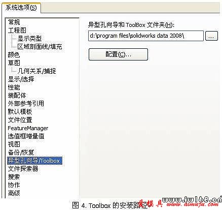 “工具——选项——系统选项——异型孔向导/Toolbox”进行设置。