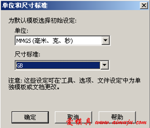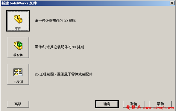 在最上方标准工具栏中点击“新建”命令(如图7所示),出现“单位和尺寸标准”对话框,如图8所示,“单位”处选择“MMGS(毫米、克、秒),“尺寸标准”选择“GB”,“确定”后,出现“新建Solidworks文件”对话框(如图9所示),选择 “零件”文件,“确定”后,系统自动进入三维建模环境,如图10所示。