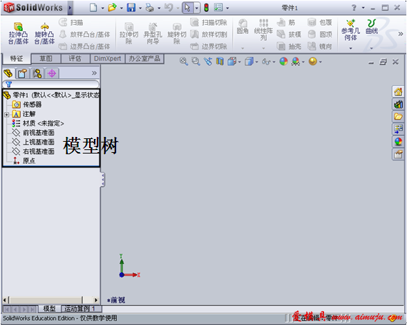 在界面左侧管理器窗口中,包含零件的模型树。模型树中显示系统默认的零件名称,并提供三个相互垂直的基准平面:前视、上视、右视基准面和坐标系原点,默认情况下,三个基准平面和坐标系原点被隐藏,不显示。