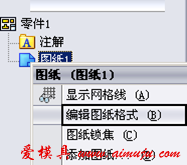 (1) 在界面左侧管理器窗口中,如图149所示,单击“图纸1”,右键菜单中选择“编辑图纸格式”命令,系统自动转换到编辑图纸状态。