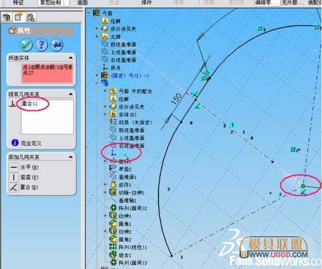 第三步:装配,只添加同轴约束。然后在装配体下编辑弓零件中上一步建立的草图,并添加拖拽点与箭杆的重合关系。如下: