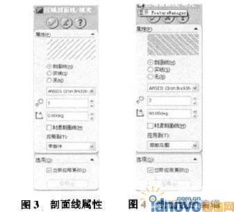 (3)选择"无"前面的单选按钮,则删除封闭区域里的剖面线;改变"剖面线图样比例"的大小,则改变剖面线的疏密大小,值越大,剖面线越密,反之,剖面线越疏;改变"剖面线图样角度"的大小,则改变剖面线的倾斜方向,角度值一般取0°或90°。