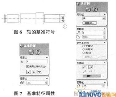 在SolidWorks"注释"工具栏里尽管有"基准特征"按钮,但标注的基准符号.大小不可编辑,因而很难与工程图比例协调,如图6.7所示。解决办法是建立一个基准符号的块(类似AutoCAD中的块定义)。先绘制基准符号,采用"践型"工具加粗其轮廓边界;然后用"注释"工具栏里的"注释"命令在基准符号里添上字母A。将基准符号和字母A选中,选择[工具]-[块]-[制作]命令,出现"块实例"属性管理器,单击编辑(E)按钮进人"块定义"属性管理器,在其中设定块的名称,基准点中设定块的参照点,也是块缩放的参照基准,引线点设定块连接到引线上的接触汽;最后在封比单击鼠标右键,在快捷莱单中选择[保存到文件],块文件的后缀为.sldblk。在SolidWorks工程图中引用块时,选择"注释"工具栏上的"块"命令,出现"块实例"属性管理器,如图8所示,在属性管理器中设定其大小与方向。