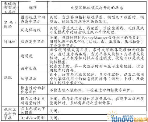 SolidWorks对于大装配体设计作了大量的优化。通过使用选项中的“大装配体选项”就可以优化软件的系统设置,提高大装配体的性能。当大型装配体模式打开时,以下选项在其各自系统选项页或工具栏中不可使用(变为灰色),并且如表2所述自动设定。当大型装配体模式关闭时,选项返回到其先前设定。