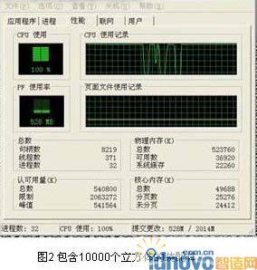 (1)在SolidWorks使用过程中启动Windows任务管理器,在性能页,如果CPU的占用率经常在100%,那么系统瓶颈就在CPU或显卡,建议升级CPU或显卡;如果系统内存大部分被占用,虚拟内存使用量又很大,操作过程中硬盘灯频繁闪烁,这说明系统瓶颈在内存,建议扩大内存。以笔者的个人计算机为例:如图1包含2500个立方体的装配体,CPU利用率正常,内存偏低,系统操作性能有些下降。如图2包含10000个立方体的装配体,CPU利用率100%,物理内存不够,启动了虚拟内存,此时系统操作性能急剧下降,无法正常进行设计工作。