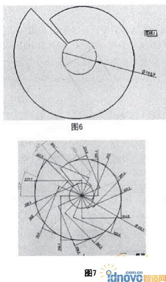 步骤3:过圆心作一水平线,将其以圆心为中心圆周阵列列16等分。则两相邻直线夹角为22.5。。依次标出各阵列直线与螺旋叶片展开图外轮廓线焦点至圆心的距离,并标出其他相关尺寸,如图7所示。至此,该锥形螺旋叶片展开图绘制完毕。