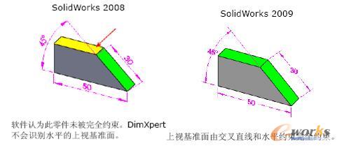 在SolidWorks 2009中,自动尺寸方案工具自动标注相交直线特征的尺寸,让SolidWorks在08版本上有了更多智能化的地方。