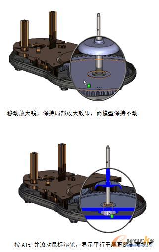 SolidWorks 2009个性化的基础功能中,放大镜视图功能是其较大的亮点。使用放大镜检查模型,在不改变总视图的情况下放大局部细节,这些操作简化了创建配合等操作的实体选择。工程师可以滚动鼠标滚轮进行放大、缩小,在选定的区域进行检查、修复等操作,还能实现剖面试图的选择。