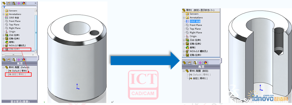 图(一) 图(二) 方法一:利用零件模型配置步骤: 1、 在零件模型新建一个切除后的配置如图(三)