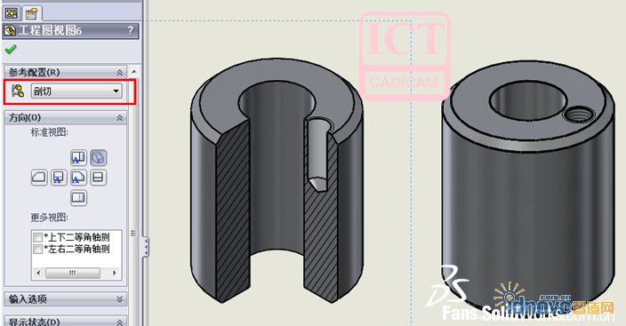如图(四)3、在图纸内点选轴测视图,在属性工具栏的“参考配置”内切换为“剖切”如再手动添加剖面线如图(五)