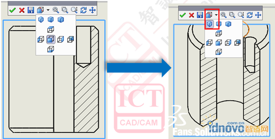 2、 利用剖面A生成轴测剖面图:选择剖面A 利用前导视工具栏里面的3D工程视图旋转剖面A 我们也可以也可以用里面的视图定向定位剖面A如图(七)