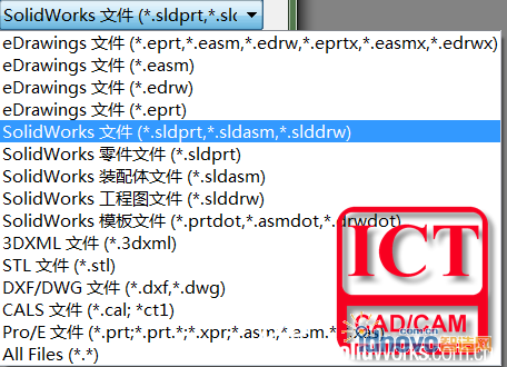 有了eDrawings Professional,您可打开 SolidWorks 文件,当然除了SolidWorks文件,eDrawings Professional还支持DXF/DWG、3D XML、以及 eDrawings 等格式文件。如右图所示: