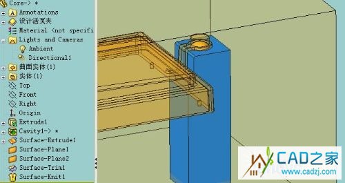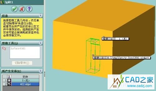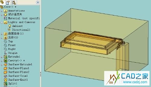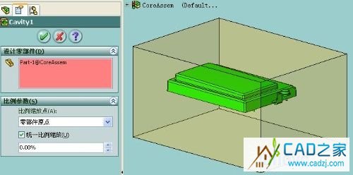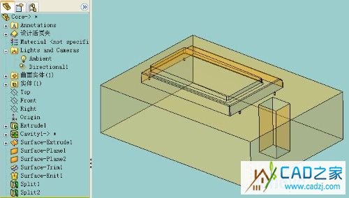 Core.sldprt中画一个立方体,大小为Cavitiy和Core的整体尺寸。