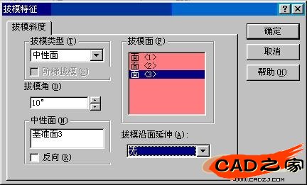 4、选择基准面3作为中性面,输入拔模角:10,按确定。