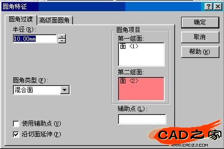 观测一下,您作的的对吗?注意,作为混合面圆角,有两种确定半径的方式:直接输入半径。或者以某一边作为圆角的终止。我们上述的做法是第二中。对比一下: